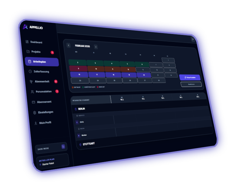 Mit Appellio erstellen Sie Arbeitspläne, erfassen Arbeitszeiten und verwalten Abwesenheiten einfach und zentral. KI-gestützte Funktionen helfen Ihnen dabei, Prozesse zu automatisieren und Zeitaufwände noch effizienter zu planen.
