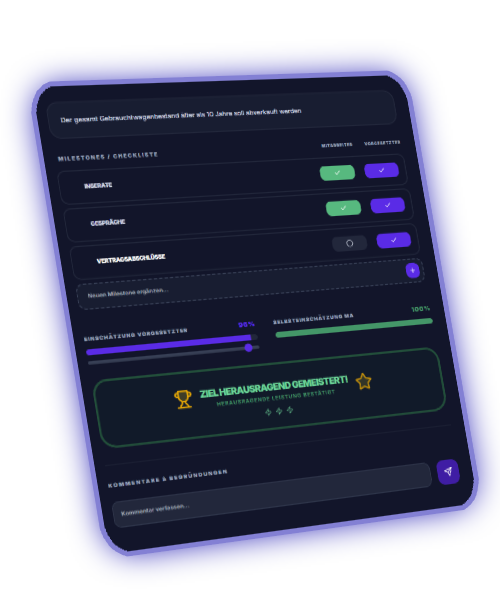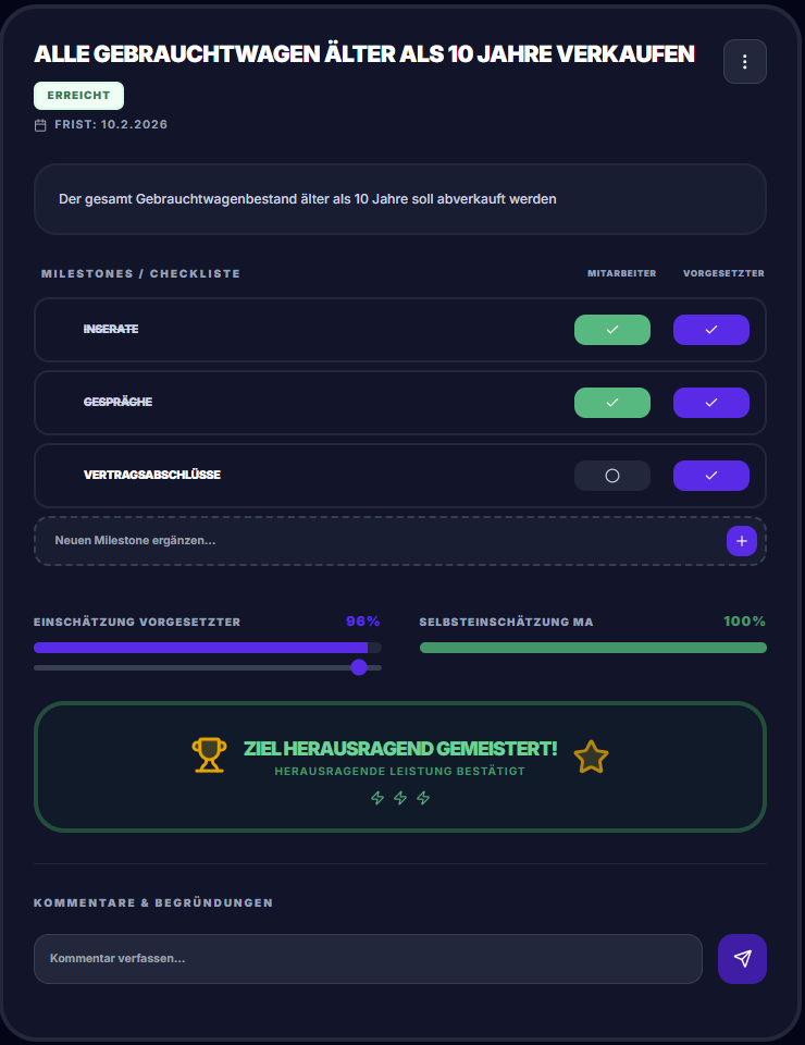 Erfolge werden sichtbar: animierte Celebration-Overlays, Fortschrittsbalken und Ziel-Meilensteine motivieren Teams nachhaltig. Mitarbeitende sehen ihren Fortschritt in Echtzeit – und bleiben engagiert, ohne zusätzlichen Verwaltungsaufwand.