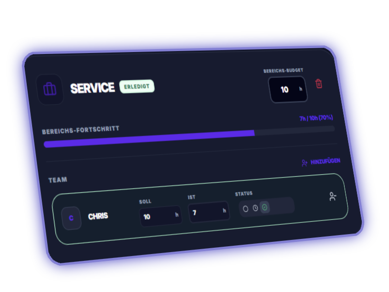 Statt isolierter Tools erhalten Sie klare Abläufe, verlässliche Daten und volle Transparenz über Auslastung, Budgets und Arbeitszeiten – unterstützt durch intelligente KI-Analysen.
